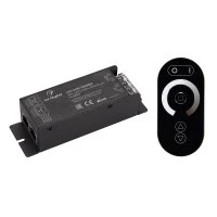 Диммер (овальный черный радиопульт с 5 кнопками и сенсорным кольцом). Управление яркостью с помощью сенсор. кольца, 12-24V, 300-600W, 25A/канал, 1 канал. Габариты диммера 127x41x32 мм, габариты пульта 114х56х23 мм.