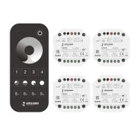 Комплект - 4шт 1-канальных диммров с радиопультом черного цвета с сенсорным кольцом и 12 кнопками, для управления одноцветными источниками света 230В, Такими как галогенные и лампы накаливания. Пульт имеет горячие кнопки предустановок яркости свечения и возможность управления 4-мя зонами и памятью 4-х сцен. Этот комплект устройств позволит легко и удобно регулировать яркость освещения и осуществлять включение и выключение света. Питание каждого диммра имеет диапазон напряжений от 100В до 240В, максимальный ток 1.5А на 1 канал, максимальная мощность 150-360Вт (в зависимости от напряжения питания). Диммр имеет функцию управления внешней кнопкой. Питание пульта осуществляется от батарейки CR2032. Габариты диммра составляют 52x52x26мм габариты пульта составляют 135x40x11мм