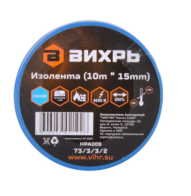 Изолента (10м х 15мм) синяя Вихрь 73/3/3/2