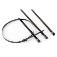 Хомуты из нержавеющей стали с эпоксидно-полиэстерным (ЭП) покрытием предназначены монтажа трасс в условиях широкого диапазона температур, а также в условиях экстремально больших перепадов температур, химически агрессивных сред и больших нагрузок на разрыв, а также для монтажа в условиях особых требований по защите соединяемых материалов от контакта разнородных металлов для уменьшения коррозии. Материал полосы и замка – нержавеющая сталь AISI 304. Сталь AISI 304 имеет высокие показатели устойчивости к коррозии в агрессивных средах, высокое сопротивление окислению и отличные низкотемпературные свойства. Эпоксидно-полиэстерное покрытие решает вопрос совместимости материалов (ГОСТ 9.005-72), используемых для монтажа. Температура эксплуатации от -80 до +150 °С. Предельная нагрузка – от 47 до 204 кг (ширина 12 мм) на замкнутое кольцо. Размеры: ширина - 7.9 мм, длина - 1000 мм.