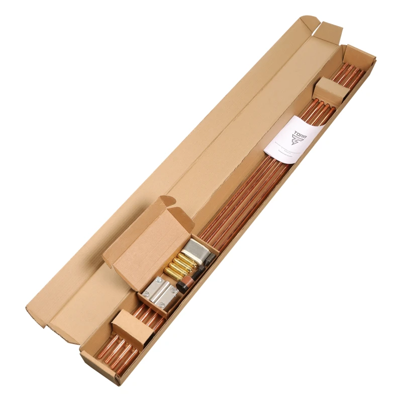 Комплект омедненного заземления TORR-6М представляет собой модульно-штыревую конструкцию рабочее состояние которых не зависит от климатических условий. Высокая устойчивость к коррозии обеспечивается благодаря медному покрытию вертикальных заземлителей, а также использовании токопроводящей пасты и гидроизоляционной ленты. Срок службы комплекта заземления в грунте может достигать 70 лет. Основным элементом модульно-штыревого заземления является, стальной стержень, покрытый слоем меди (250 мкм). На концах стержня имеется резьба для соединения стержней с латунными муфтами.