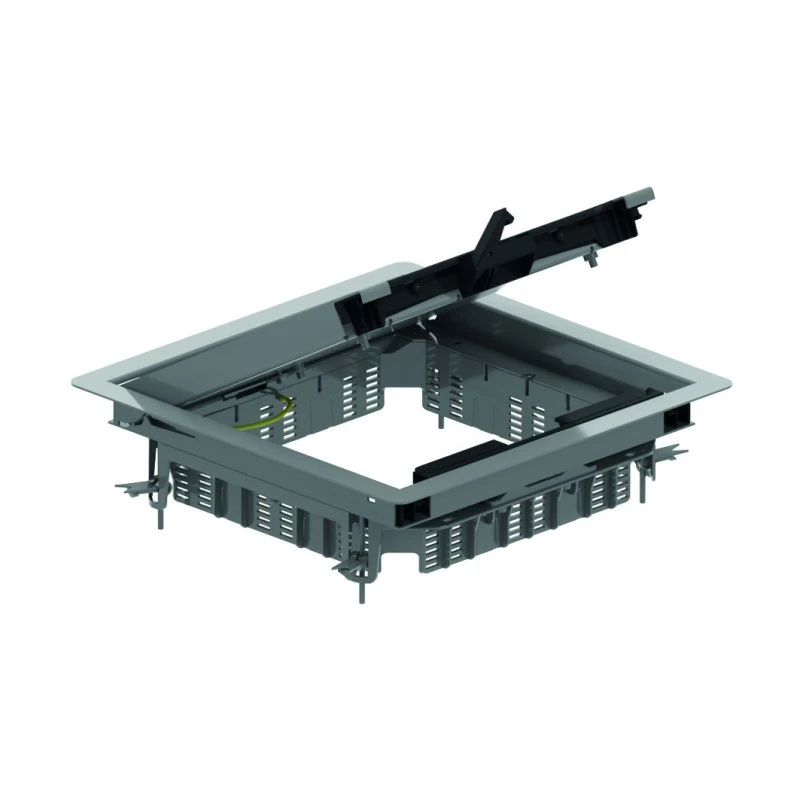 KDVIRK3 - это квадратный лючок с откидной крышкой, который имеет встроенную рамку с кромкой. Он также оснащен крышкой под плитку и имеет возможность выводить кабель. Максимальная концентрированная нагрузка составляет 2000 Н, а максимальная распределенная - 3000 Н. Устройство имеет степень защиты IP 20/30 и максимальную глубину расположения в 26 мм. Обычно используется нержавеющая сталь 304 для изготовления устройства. Лючок предназначен для размещения 3 коробок и позволяет регулируемую глубину расположения для напольного покрытия, используя пластины OHEV3.2 или OHEV3.5. Он закрепляется в фальшполу с помощью встроенных универсальных зажимов, а отверстия в напольных панелях имеют размер 270x270 мм.