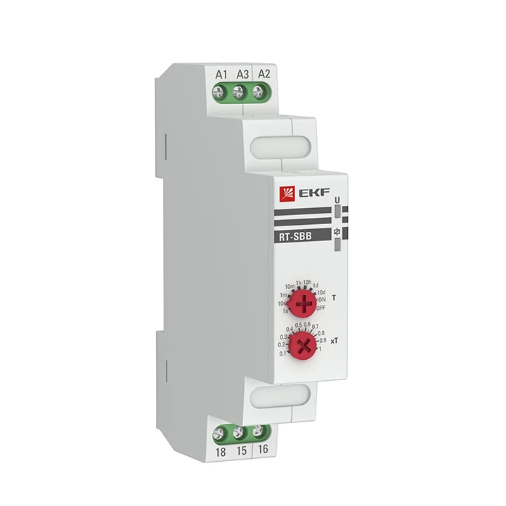 Реле времени RT- SBB EKF PROxima является электронным коммутационным аппаратом с регулируемой установкой времени. Реле предназначено для подачи импульса необходимой продолжительности при включении реле. Переключение диапазона времени производится с помощью поворотного регулятора расположенного на лицевой поверхности реле. Реле времени соответствует ГОСТ 30804.4.4-2013 (IEC 61000-4-4:2004). Реле применяется в системах промышленной и бытовой автоматики: в вентиляционных, отопительных, осветительных системах.
