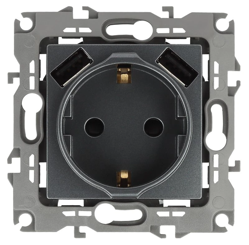 Розетка 2P+E 16A-250В, штор. с 2xUSB 5В-3А, Эра12, графит (10/100/2000) 12-4109-12 ЭРА Б0047846