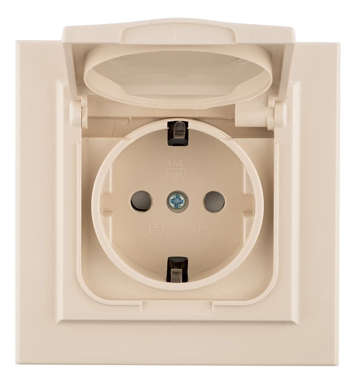 Розетка Минск 1-местная СП с заземлением с крышкой 16А бежевая с защитными шторками IP44 EKF ERR16-029-200-44