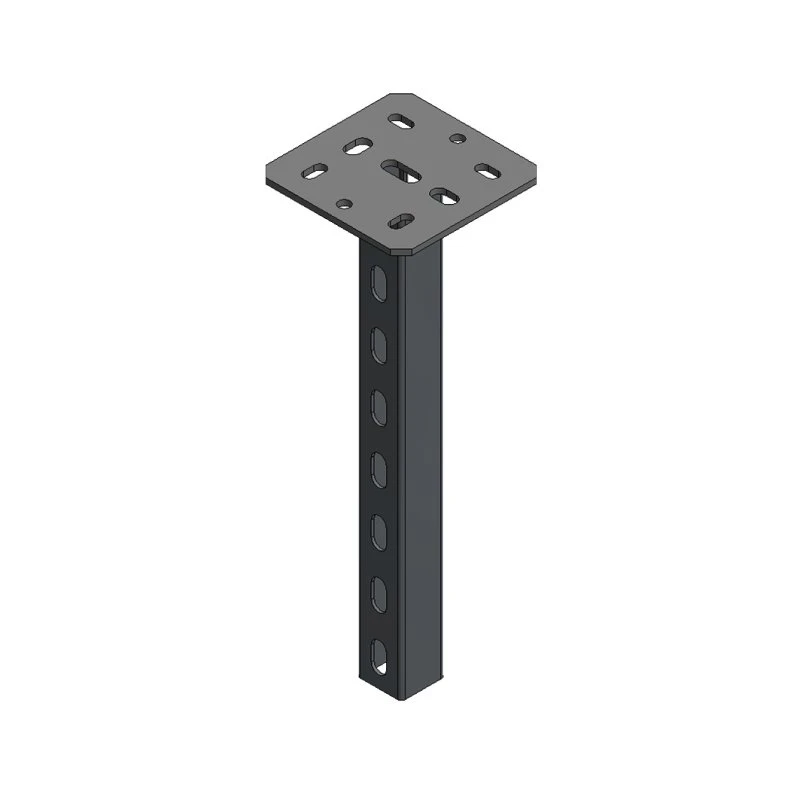 HSMES - это потолочная стойка, предназначенная для поддержки различных конструкций и оборудования в помещениях. Стойка выполнена из профиля MP41.41S и имеет приваренную опорную пластину размером 135x135 мм. Длина стойки может быть изменена по запросу до 2000 мм. Максимальная нагрузка на стойку составляет 1800 кг. Стандартное исполнение - гальваническое цинковое покрытие. Также возможно изготовление стойки с горячим цинкованием или полиэфирным порошковым покрытием.