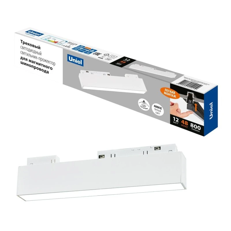 Светильник-прожектор линейный светодиодный трековый ULB-M70-12W/4000K/35 WHITE предназначен для освещения коммерческих и бытовых помещений, таких как торговые центры, выставочные павильоны, рестораны, отели. Прожектор монтируется на магнитные токопроводящие шины (треки) и фиксируется с помощью мощных магнитов. Специальная конструкция проводников шинопровода исключает возможность неправильного подключения светильников. Трековые светильники незаменимы для акцентного освещения и оригинальных световых решений. Мощность светильника составляет 12 Вт, световой поток 1000 лм. Цвет свечения - белый. Цветовая температура 4000К. Корпус прибора изготовлен из алюминия, окрашенного в белый цвет. Способ установки - трековый. Степень пылевлагозащиты светильника IP20. Диапазон рабочих температур прожектора от -20 до +40 °С. Требуется подключение к электросети. Габариты устройства - ДхШхВ 300х35х65 мм. Вес изделия - 340 г. Гарантия - 3 года. Срок службы светильника - 50 000 часов.