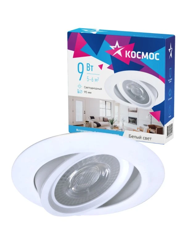 Поворотный светодиодный спот 9 Вт под стандартное посадочное место 95мм. Осветит пространство площадью 5-6 м2. Споты светят пучком в 45°, что создаёт нужные световые акценты в современном освещении. Для этого их можно повернуть в нужную сторону. Совместим с любыми типами подвесных потолков - натяжных, реечных, из ГКЛ и др. Толщина светильника 41мм, диаметр 113мм. Стабильный свет без падения яркости в течение всего срока службы (30 000 часов) – за счет использования светодиодов известных производителей. светильник работает в диапазоне от 180В до 265В - не перегорит и не потеряет яркость при скачках напряжения в сети. Цвет свечения панели - 4000 К нейтральный белый, идеально подойдет для кухни, коридора, и других зон, где требуется нейтральный свет. ''Здоровый'' свет без мерцания не утомляет глаза, а высокий индекс цветопередачи передает естественные цвета и оттенки.