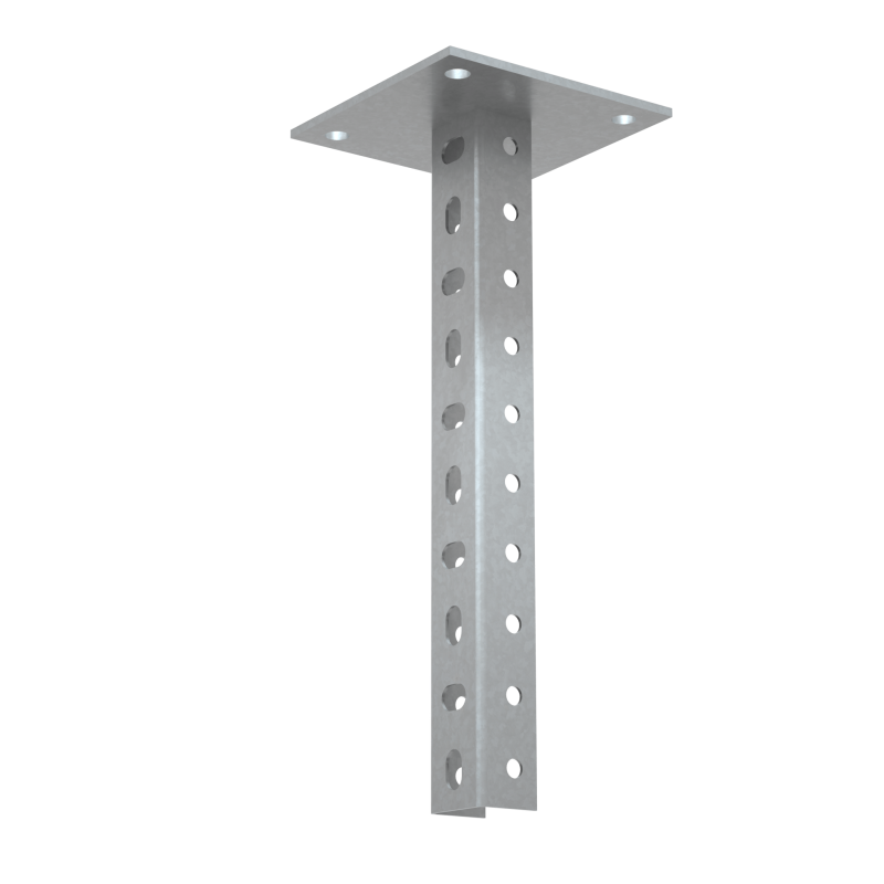 Серия элементов на основе п-образного профиля с приваренным на торце основанием, для крепления металлических лотков к несущей поверхности на любой высоте. Конфигурация изделий придаёт конструкции дополнительную жесткость и прочность. Универсальная потолочная стойка с тройной перфорацией применяется для потолочного или напольного крепления кабельной трассы. Отверстия разного диаметра позволяют использовать различные крепёжные элементы для фиксации. Элемент выполнен из нержавеющей стали марки AISI304 – материала устойчивого к коррозии, высоким температурам и агрессивным средам. Используется на предприятиях пищевой и медицинской промышленности, химических заводах, в морских и прибрежных зонах, в соответствии с ГОСТ 15150-69.