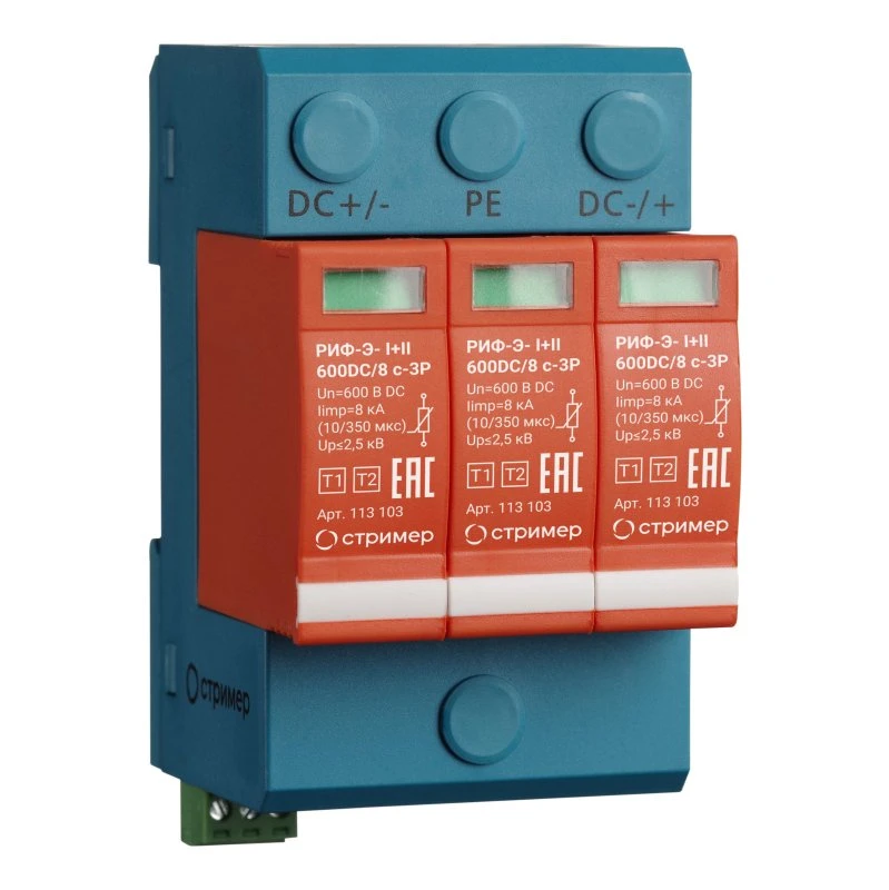 УЗИП (Устройство защиты от импульсных перенапряжений) для систем постоянного тока РИФ-Э-I+II 600DC/8 с-3P СТРИМЕР 113103