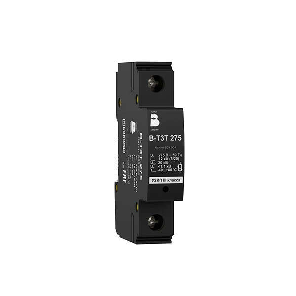 Однополюсное УЗИП класса испытаний III ограничивающего типа. Моноблочный корпус, оснащено терморасцепителем. Применяется для защиты фазного проводника в системах переменного тока. Uс - 275 В АС. Imax(8/20) - 12 кА.