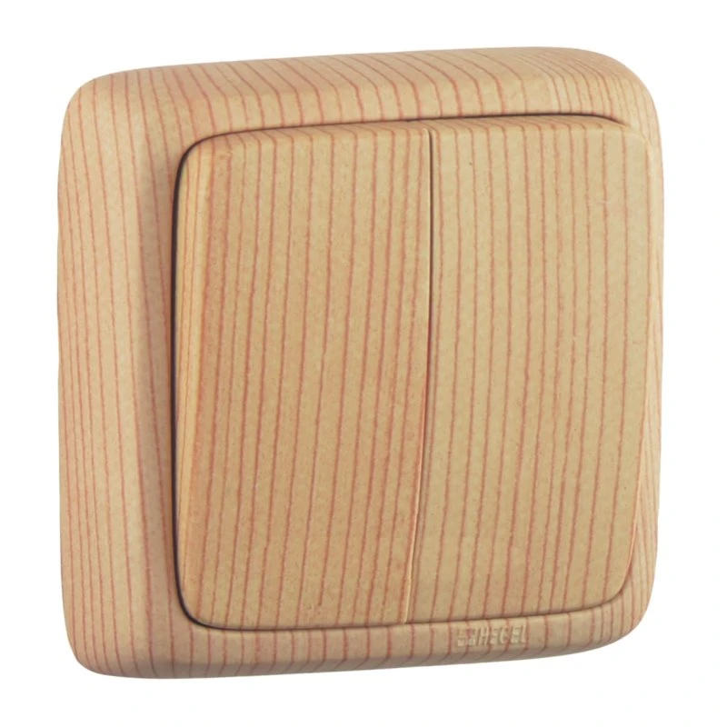 Выключатель двухклавишный наружный с изоляционной пластиной сосна 10А HEGEL ВА10-153-02