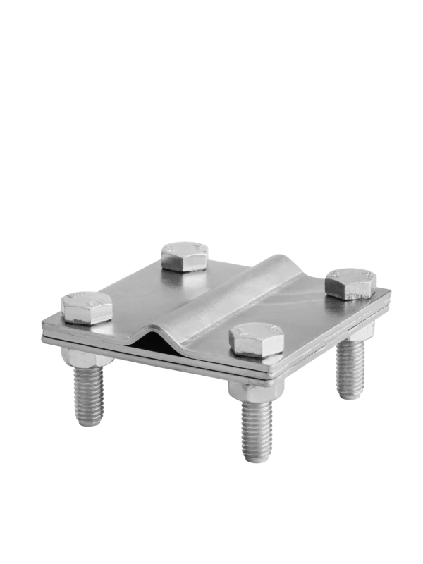 Зажим выполнен из оцинкованной стали и используется для соединения прутка и полосы, прутка с прутком, полосы с полосой Т-образным либо параллельным способом. Зажим стягивается при помощи четырех шестигранных болтов с гайками с резьбой.